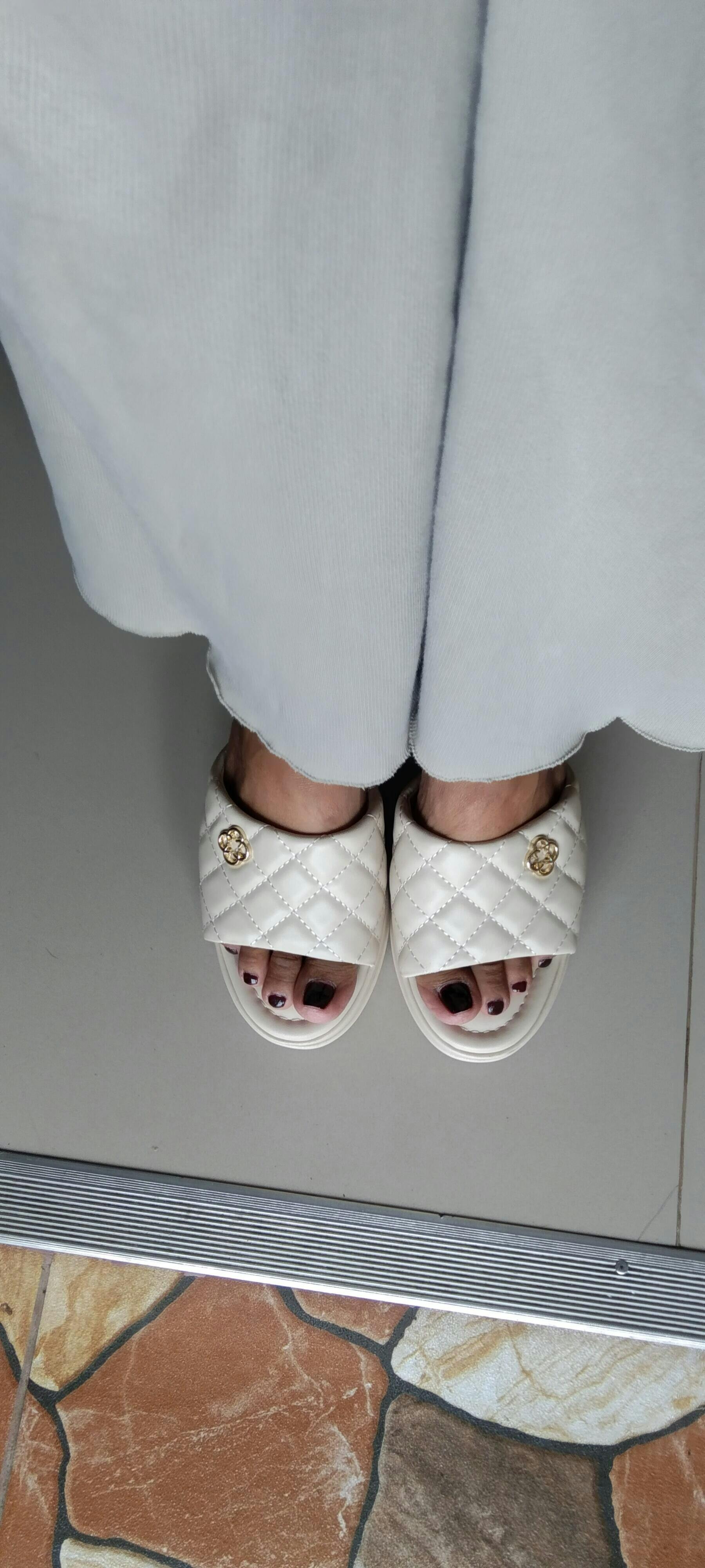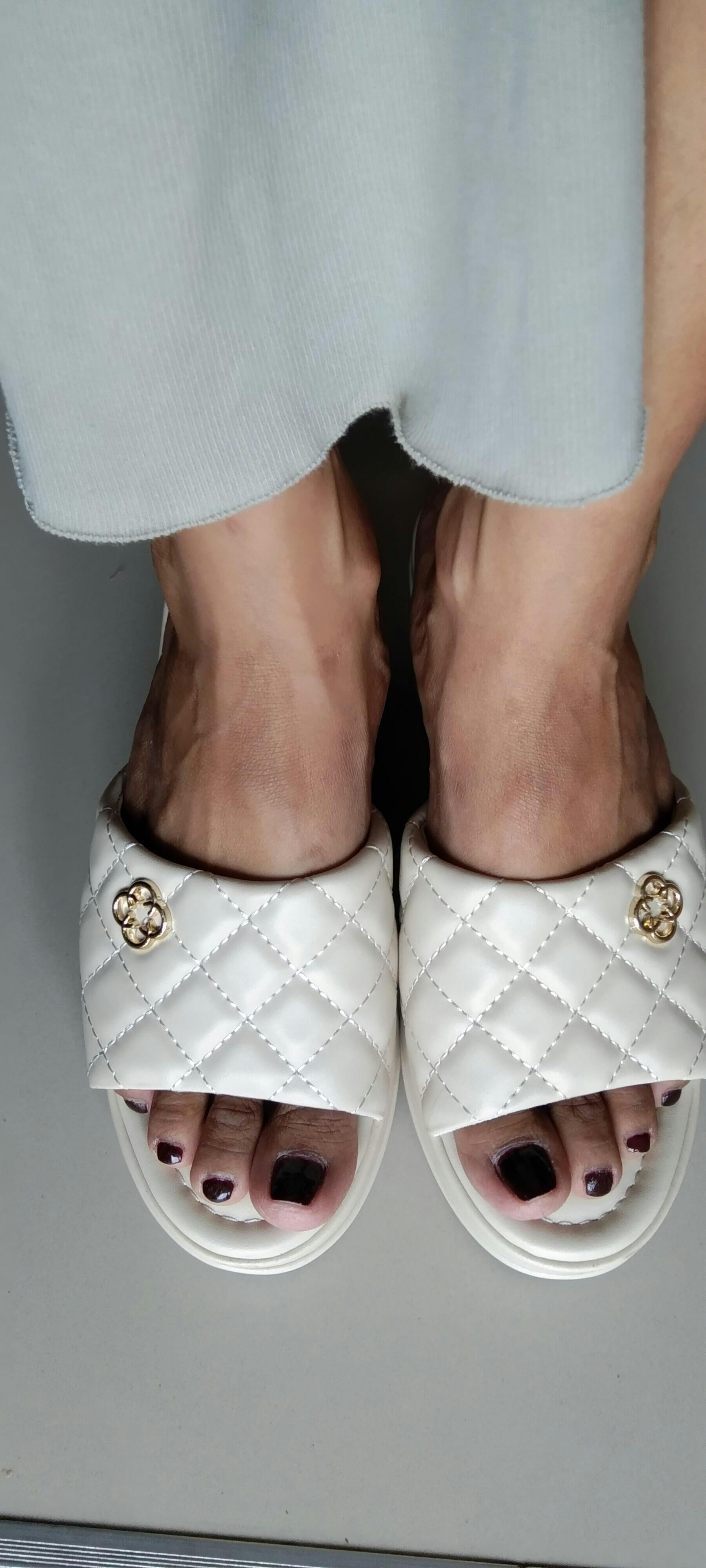 Wedge slides with quilted upper and flower logo buckle design